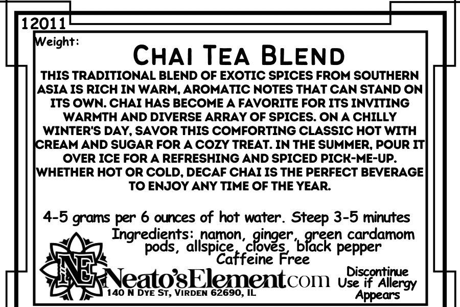 This traditional blend of exotic spices from Southern Asia is rich in warm, aromatic notes that can stand on its own. Chai has become a favorite for its inviting warmth and diverse array of spices. On a chilly winter's day, savor this comforting classic hot with cream and sugar for a cozy treat. In the summer, pour it over ice for a refreshing and spiced pick-me-up. Whether hot or cold, Decaf Chai is the perfect beverage to enjoy any time of the year.
