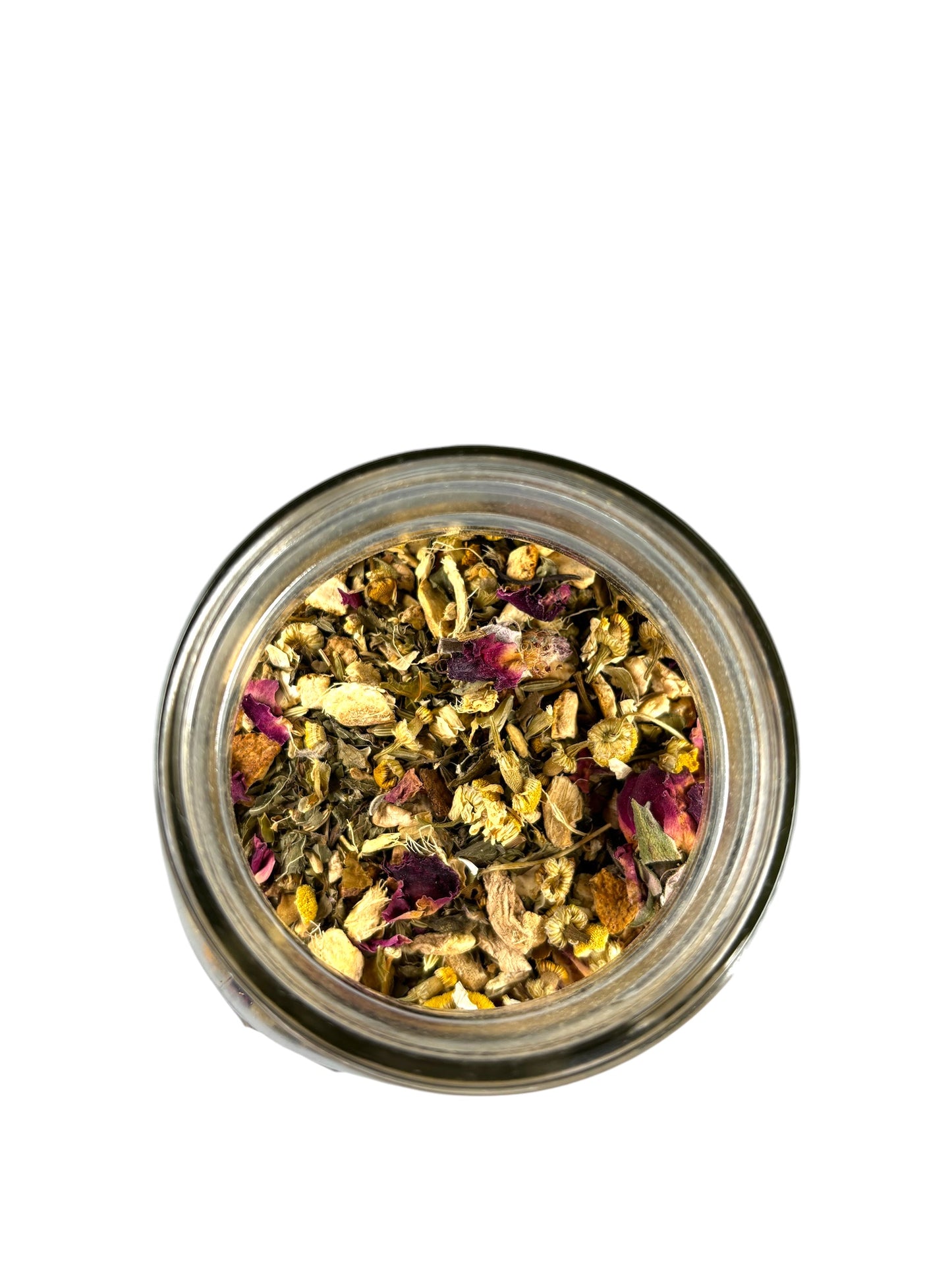 Ingredients: Peppermint, Ginger, Orange Peel, Fennel, Lemon Balm, Chamomile, Rose Petals, and Papaya Leaf. Caffeine Free