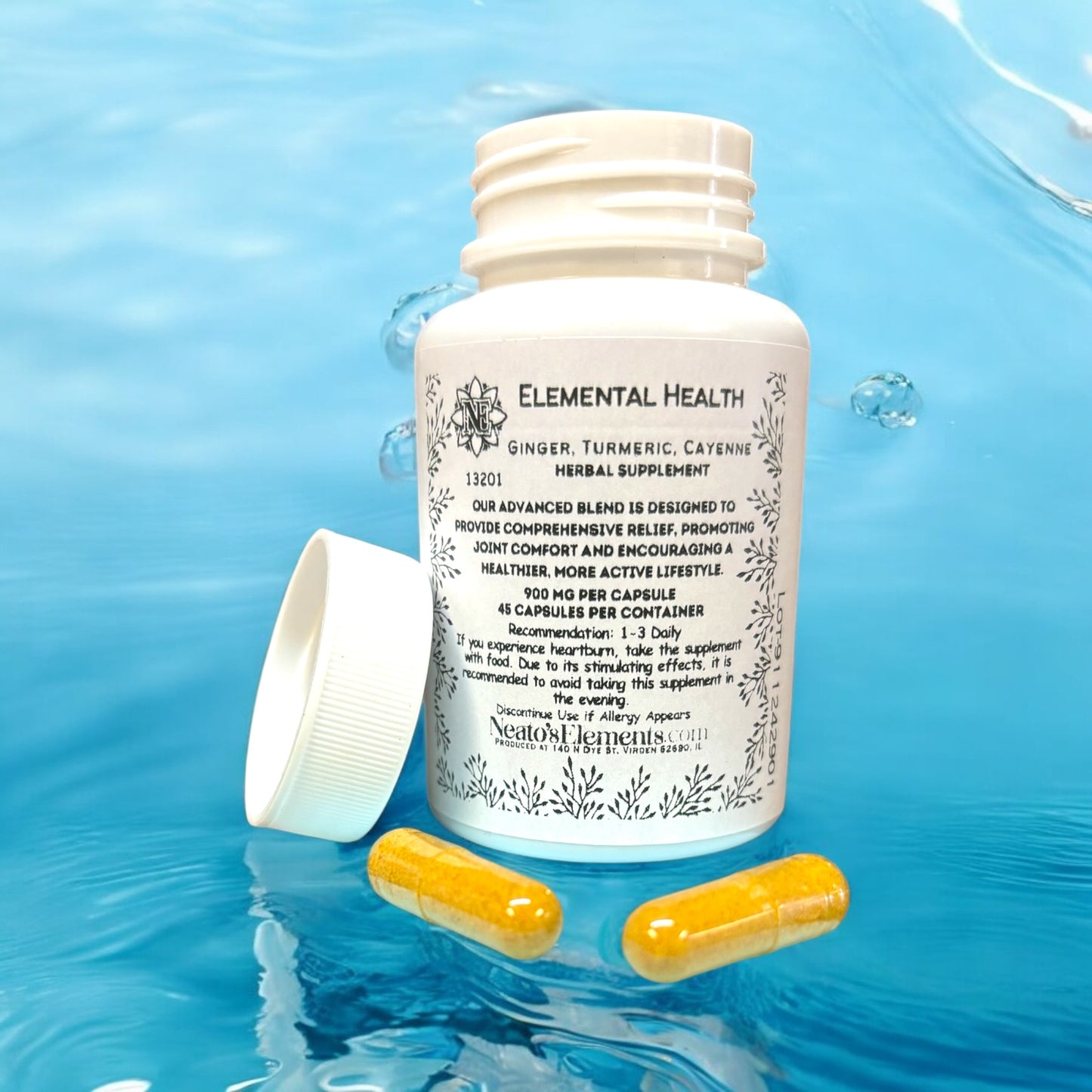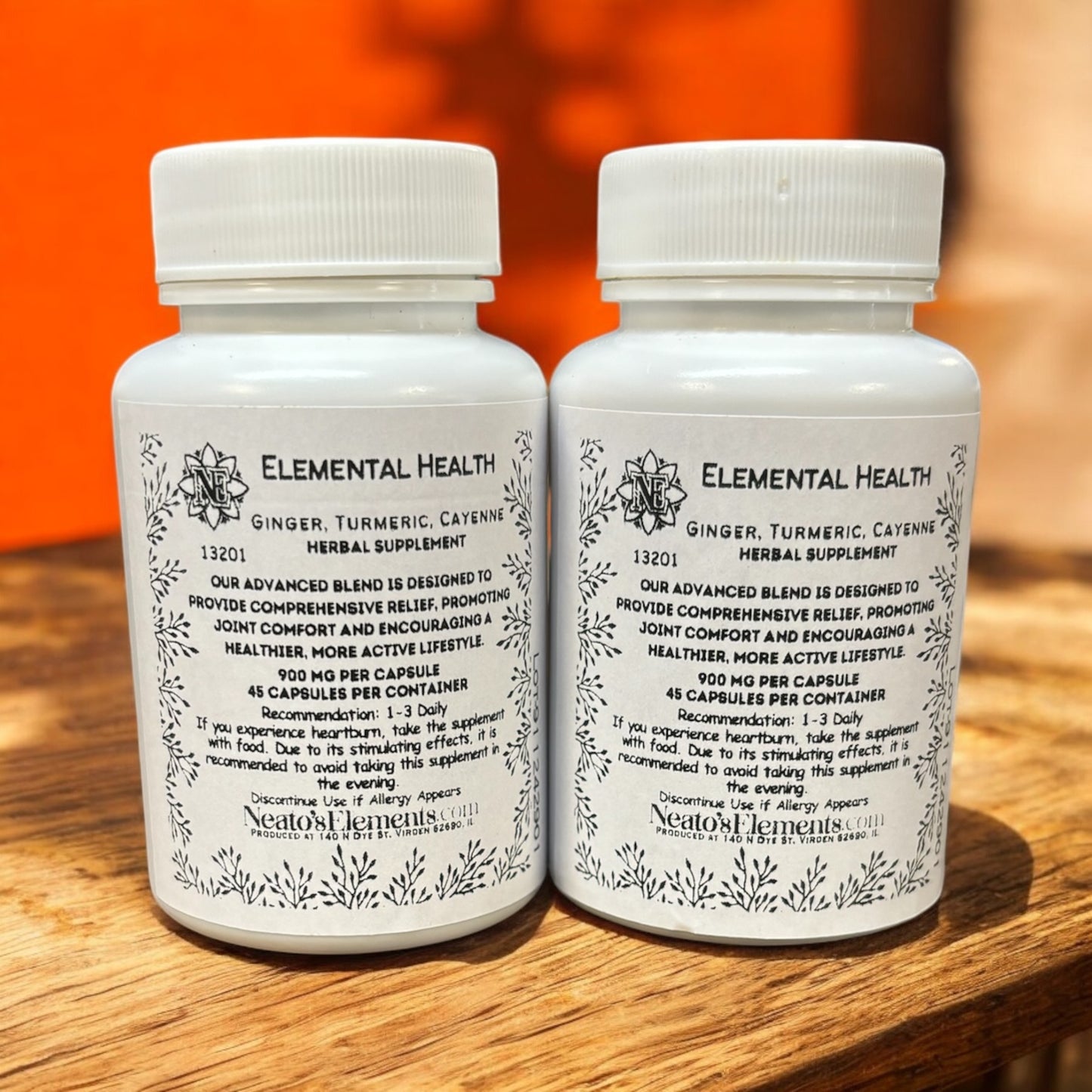 Introducing Elemental Health: Ginger, Turmeric, and Cayenne Pepper Capsules – a powerful blend crafted to support your body's natural defenses and boost vitality. Each capsule contains 900 mg of potent ingredients, including 100 mg of cayenne pepper, 400 mg of ginger, and 400 mg of turmeric, thoughtfully formulated to address inflammation, energy levels, and circulation.