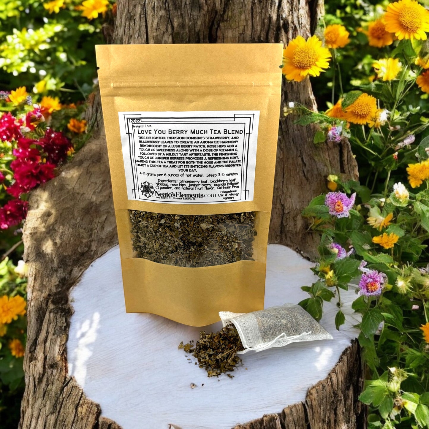 Ingredients: Strawberry leaf, blackberry leaf, hibiscus, rose hips, juniper berry, acerola (vitamin C) powder, and natural fruit flavor. Caffeine Free