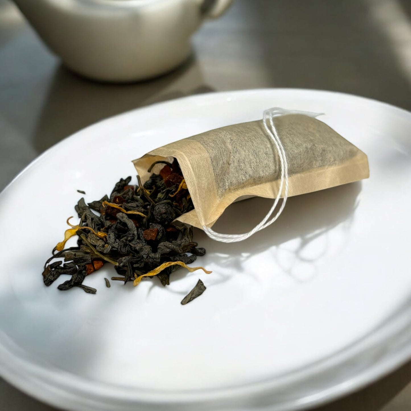 Ingredients: (Camellia sinensis) Gunpowder Green Tea, Green Tea, Jasmine, marigold petals, cinnamon chips, diced apricot pieces, and apricot essences. Contains Caffeine
