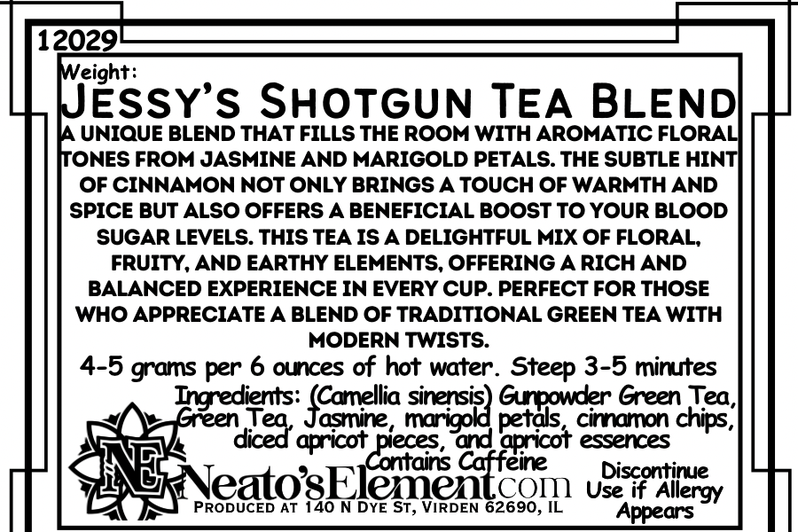 Ingredients: (Camellia sinensis) Gunpowder Green Tea, Green Tea, Jasmine, marigold petals, cinnamon chips, diced apricot pieces, and apricot essences. Contains Caffeine