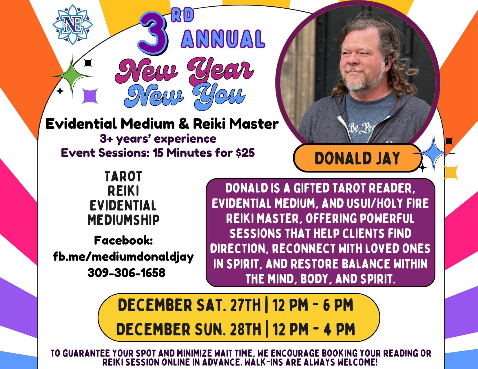 We’re excited to welcome Donald Jay to our 3rd Annual New Year, New You Event! Donald brings a grounded and compassionate approach to healing, connection, and spiritual insight. With over three years of dedicated experience, he supports clients on their personal journeys through clarity, evidence-based mediumship, and restorative energy work.