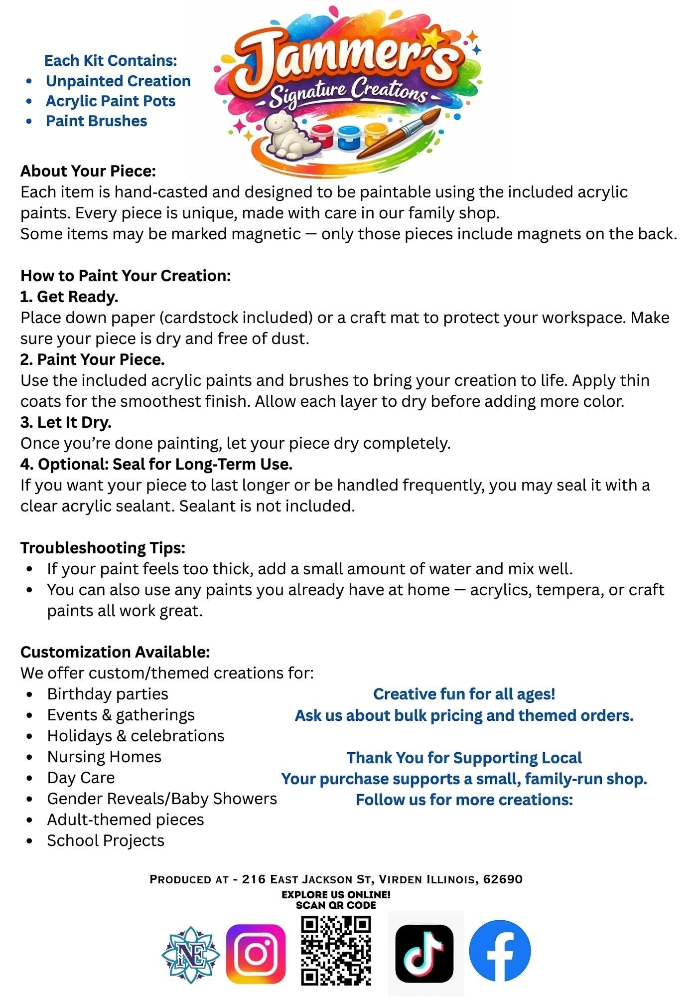 Each item is hand‑casted in our family shop and designed to be fully paintable using the included acrylic paints.