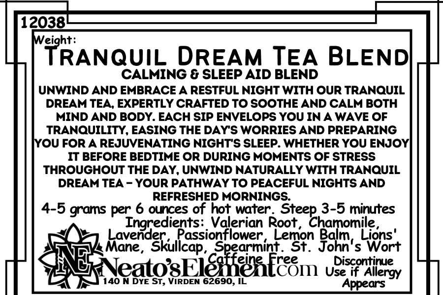 Unwind and embrace a restful night with our Tranquil Dream Tea, expertly crafted to soothe and calm both mind and body. Each sip envelops you in a wave of tranquility, easing the day's worries and preparing you for a rejuvenating night's sleep. Whether you enjoy it before bedtime or during moments of stress throughout the day, Unwind naturally with Tranquil Dream Tea — your pathway to peaceful nights and refreshed mornings.