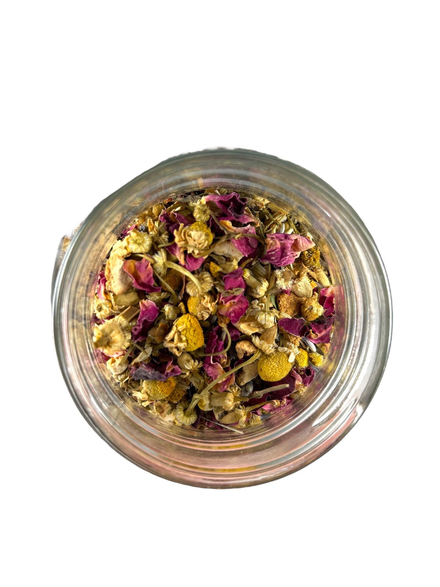 Ingredients: Chamomile, rose petals, orange peel, oat straw, lemon balm, lavender, and stevia. Caffeine Free