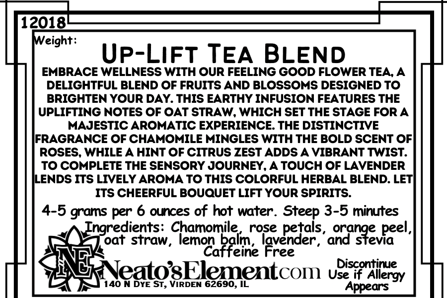 Embrace wellness with our Feeling Good Flower Tea, a delightful blend of fruits and blossoms designed to brighten your day. This earthy infusion features the uplifting notes of oat straw, which set the stage for a majestic aromatic experience. The distinctive fragrance of chamomile mingles with the bold scent of roses, while a hint of citrus zest adds a vibrant twist. To complete the sensory journey, a touch of lavender lends its lively aroma to this colorful herbal blend. let its cheerful bouquet lift your spirits.