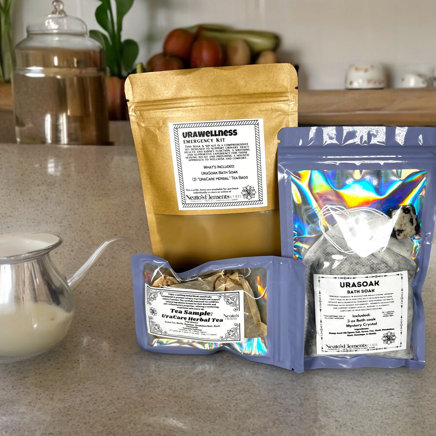 This Soak & Sip kit is a comprehensive set designed to support urinary tract health and kidney function. a soothing and supportive experience for those seeking relief and providing a holistic approach to wellness and comfort.